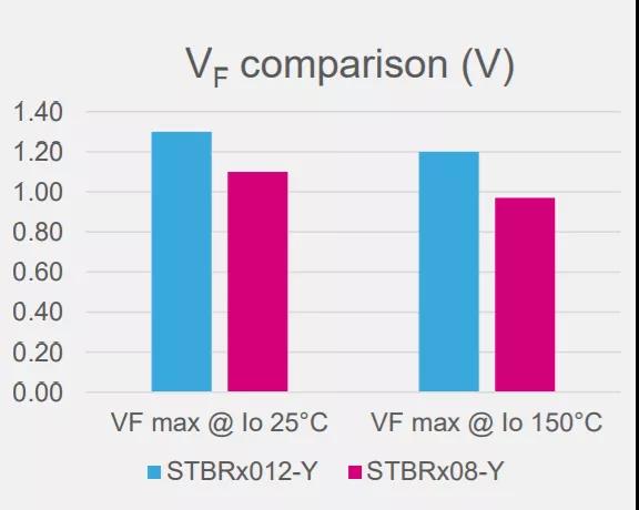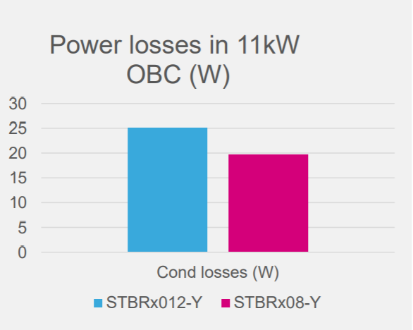 相較于STBR 1200V系列,STBR 800V系列的VF(正向電壓)降低了200 mV,將11kW OBC的功耗降低5 W,工作結(jié)溫降低15℃。因此,STBR800V系列能夠降低車載產(chǎn)品的熱應(yīng)力,進(jìn)而提高重載應(yīng)用的系統(tǒng)可靠性,廣泛用于包括OBC、充電站、可再生能源轉(zhuǎn)換器等應(yīng)用產(chǎn)品。