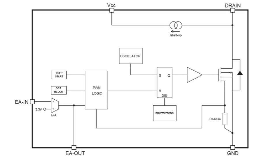 VIPer122系列器件采用10引腳的封裝方式,包括:1個GND、1個VCC、1個NC、1個EA-OUT、1個EA-IN和5個DRAIN。其中,內置高壓開關啟動偏置電流來自DRAIN。